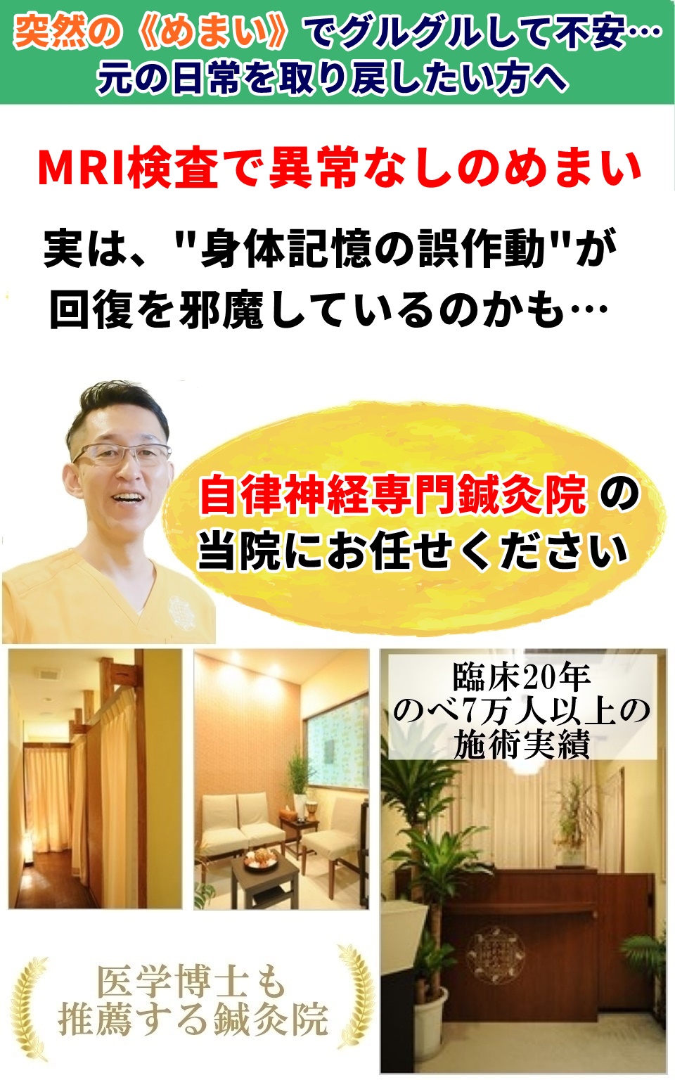 なぜなら、20年以上、のべ7万人を超える施術の中で、めまいで苦しむ方々が抱える想いを、共に深く見つめてきたからです。